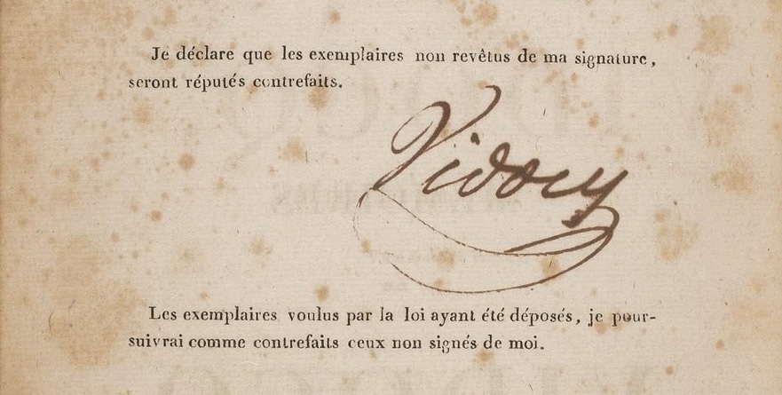 The promise was patently false, as the new ghostwriter, L’Héritier, served up dozens upon dozens of over-the-top exploits directed by Vidcoq, capped by the recycled story of Adèle d’Escars. To reassure readers about the authenticity of the subsequent volumes, Vidocq added a proclamation to the frontispiece of each title page: “I declare that issues of this book not bearing my signature should be considered counterfeits” (author’s translation):