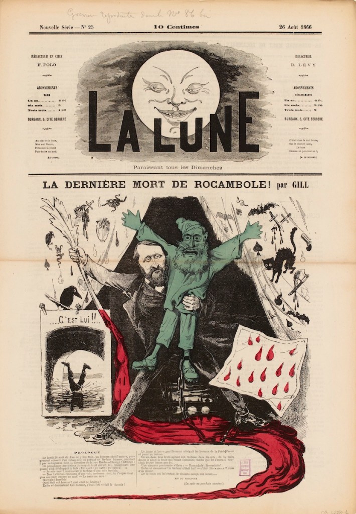 “The Final Death of Rocambole!” by André Gill. La Lune, August 26, 1866. Collection: Musée Carnavalet, Paris. A pun in French: le dernier mot (“the final word”) becomes la dernière mort (“the final death”).