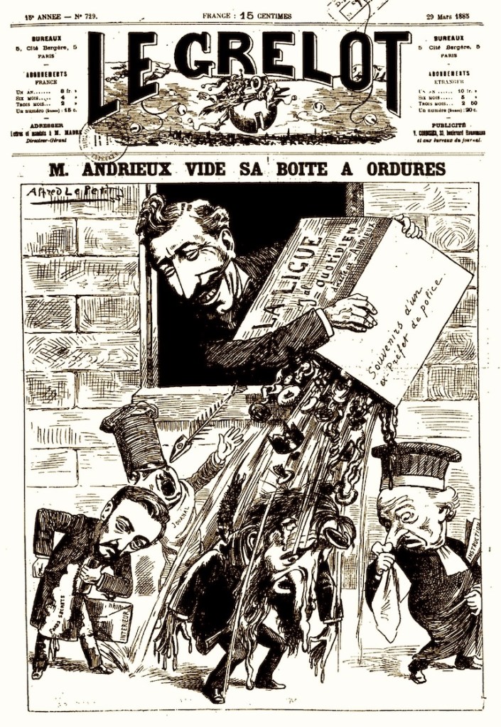 “Monsieur Andrieux Empties His Trash Bin” upon political bureaucrats, journalists, and magistrates. Caricature by Alfred Le Petit in the satirical weekly Le Grelot, March 29, 1885. The side of the box reads, “Souvenirs of a Police Prefect.” Gallica: Bibliothèque nationale de France.
