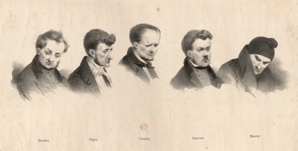 Engraved portraits of regicide conspirators Bescher, Pépin, Fieschi, Boireau, and Morey. Paris: Chez Gihault Frères, 1835. Gallica: Bibliothèqe nationale de France.