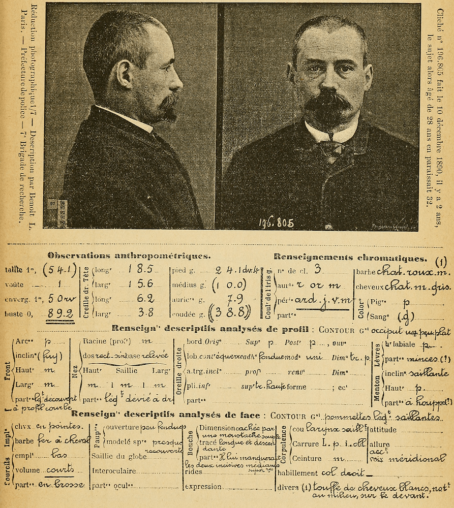 Sample portrait parlé (“talking portrait”) anthropometric identity card with Alphonse Bertillon’s self-portrait photo, May 14, 1891. Wikipedia Commons: Criminocorpus.org.
