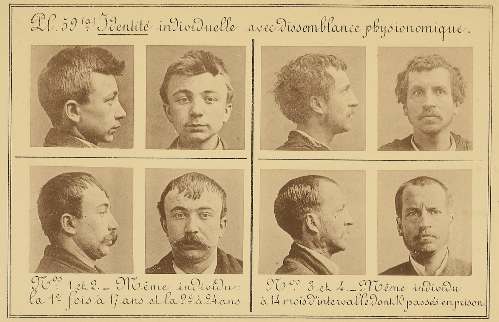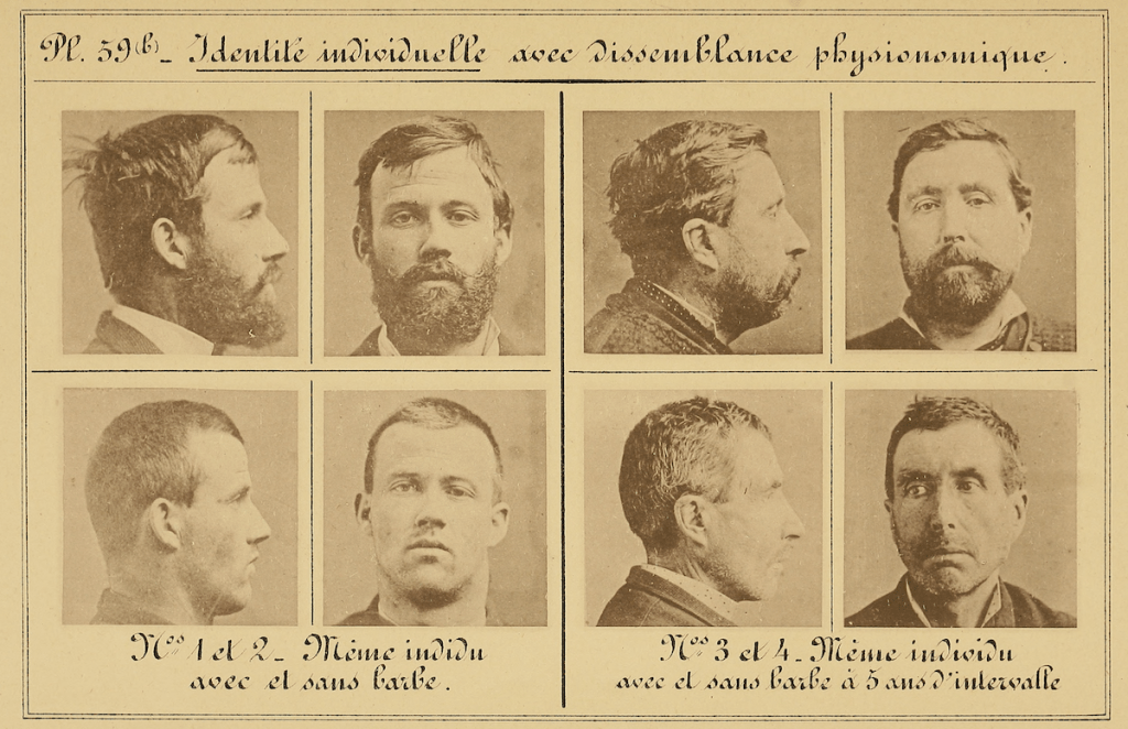 “The same individual with differences in physical appearance.” Plate 59(a): at ages 17 and 24 (nos. 1 & 2); after spending 14 months in prison (nos. 3 & 4). Plate 59(b): with and without a beard (nos. 1 & 2); with and without a beard after five-years (nos. 3 & 4). Wikimedia Commons: Identification Anthropométrique, Instructions Signalétiques (1893).
