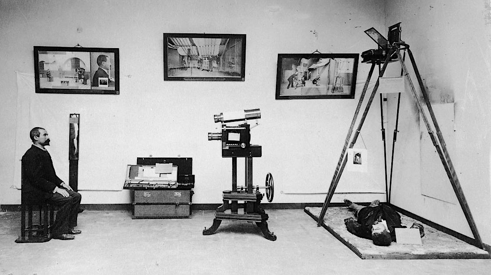 Anthropometric photography display from the Bertillon exhibition at the 1893 World’s Columbian Exposition in Chicago. Note the addition of a camera tripod on the right to photograph crime scenes. National Gallery of Canada, Ottawa. Visible Proofs: Forensic View of the Body: National Library of Medicine, Bethesda MD.