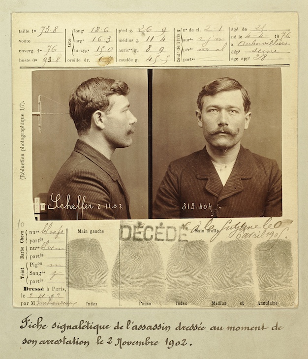 “Identity card of the murderer [Henri Leon Scheffer] made at the time of his arrest, November 2, 1902.” The card includes fingerprints from the left index finger and right thumb, index, middle, and ring fingers. DÉCÉDÉ (“DIED”) was stamped on Scheffer’s card after his death in prison on April 6, 1905. Wikimedia Commons: Service Régionale d’Identité Judiciaire, Paris.