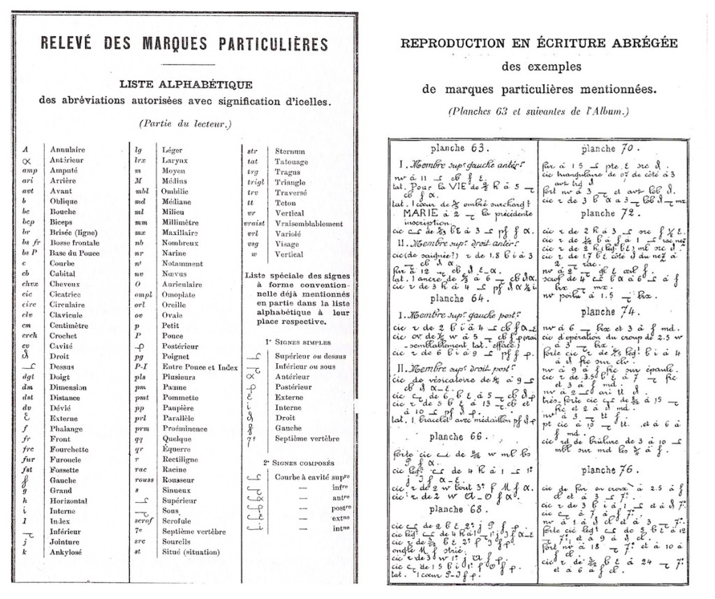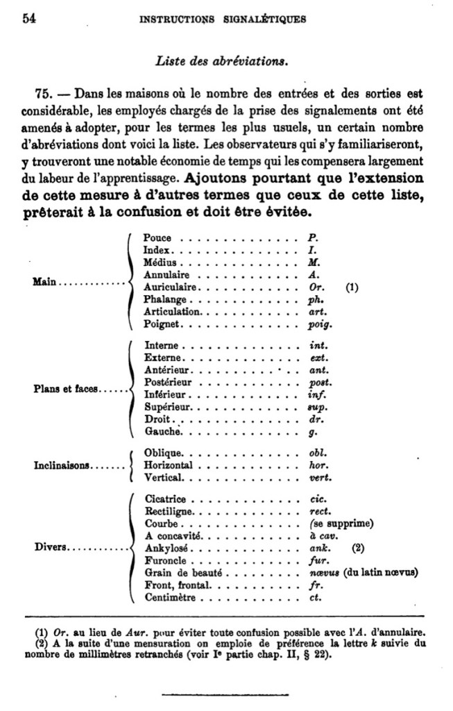 Terms and abbreviations used to annotate the portrait parlé became more extensive as well. The 1885 edition contained a limited set of terms and abbreviations used to designate the hands, face, forehead slope, and additional notations (tattoos, posture, bone stiffness, boils, skin complexion).
