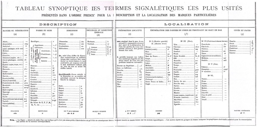 Alphonse Bertillon, “Une application pratique de l’Anthropomètrie, sur un procédé d’identification permettant de retrouver le nom d’un récidiviste au moyen de son seul signalement, et pouvant servir de cadre pour une classification de photographies à la préfecture de police, à la sûreté générale, au ministère de la justice, etc…” Annales de Démographie Internationale (Paris: G. Masson, 1881).