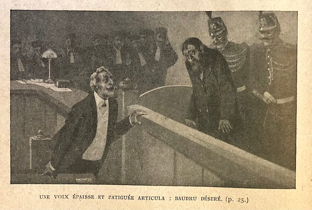 “A slow-witted and tired-out voice declared: ‘Désiré Baudru’.” Illustration in Maurice Leblanc, Arsène Lupin, Gentleman Cambrioleur, collection “Les Romans d’Aventure et d’Action” (Paris: Éditions Pierre Lafitte, 1914). Author’s collection.