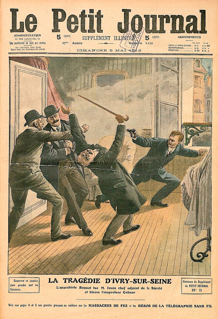 “The Ivry-sur-Seine Tragedy: The Anarchist Bonnot kills Sûreté Deputy Chief Jouin and Wounds Inspector Colmar.” Le Petit Journal, Supplément Illustré, Sunday, May 5, 1912. Gallica: Bibliothèque nationale de France, Paris.