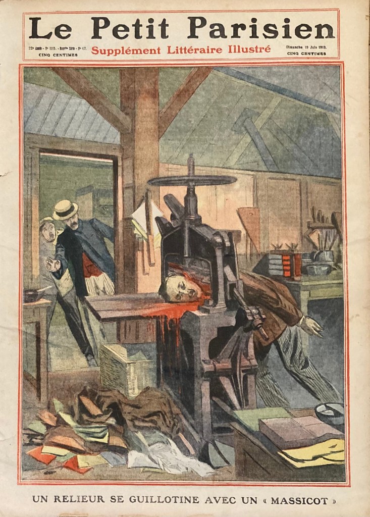 “A Bookbinder Guillotines Himself with a Paper Cutter.” Le Petit Parisien, Supplément Littéraire Illustré, Sunday, June 19, 1910. Author’s collection.