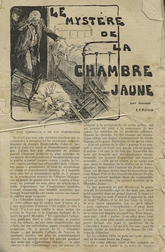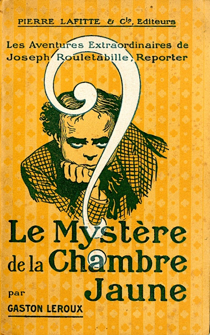 Gaston Leroux’s Le Mystère de la chambre jaune (“The Mystery of the Yellow Room”) occupies a canonical position in the development of the closed-room murder mystery novel.[1] Previous locked-room mysteries, such as Edgar Allen Poe’s “The Murders in the Rue Morgue”(1841) and Arthur Conan Doyle’s “The Adventure of Speckled Band” (1892), had been short stories. Leroux ran with the idea further by not permitting entrance or exit by means of a secret passageway, and then stretching out the solution to the impossible crime over the course of an entire novel.